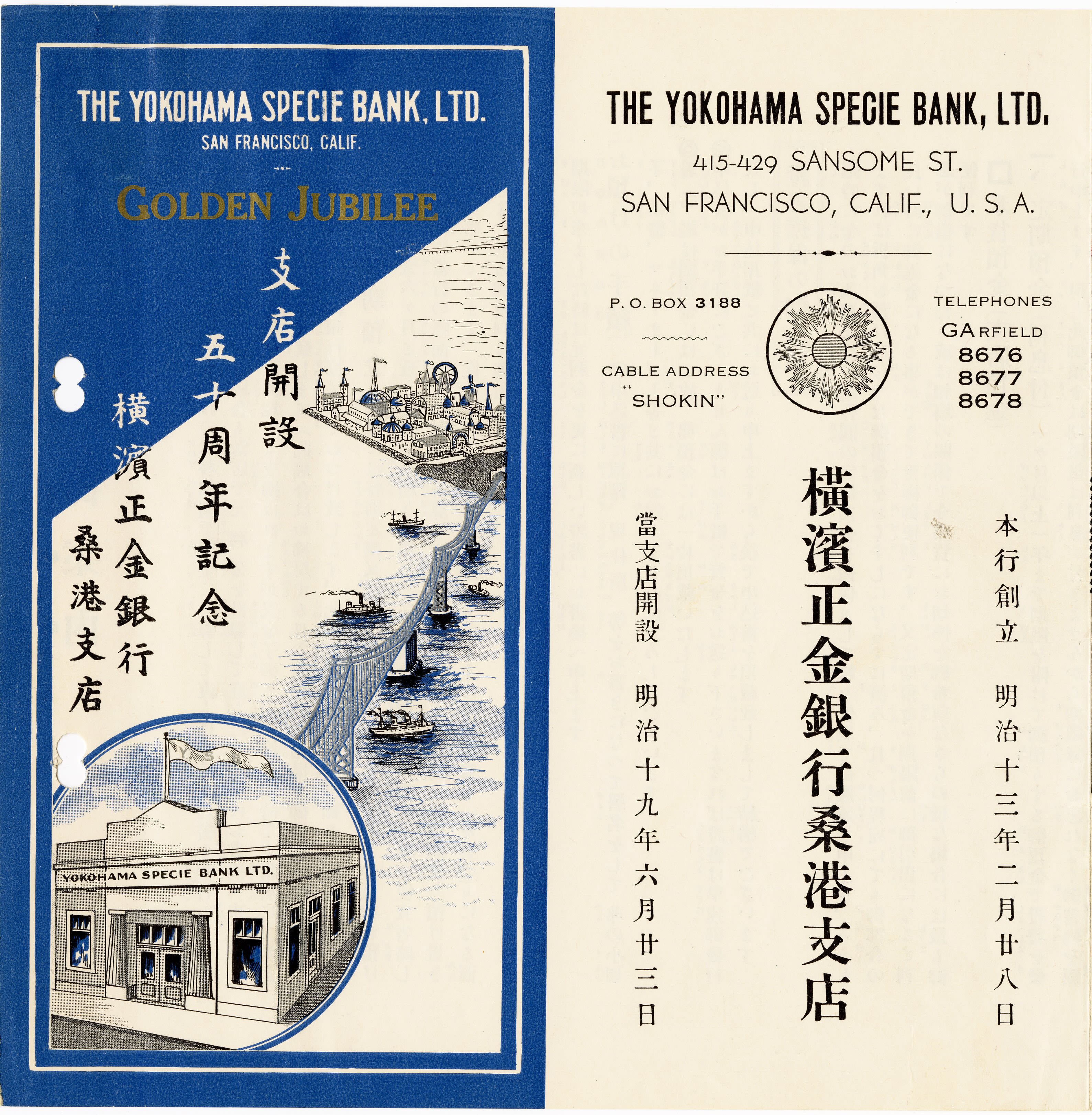In 1936, the San Francisco YSB branch celebrated its 50th anniversary with a glamorous brochure, intertwining 50 years of operation with both Japanese American and Japanese financial history.