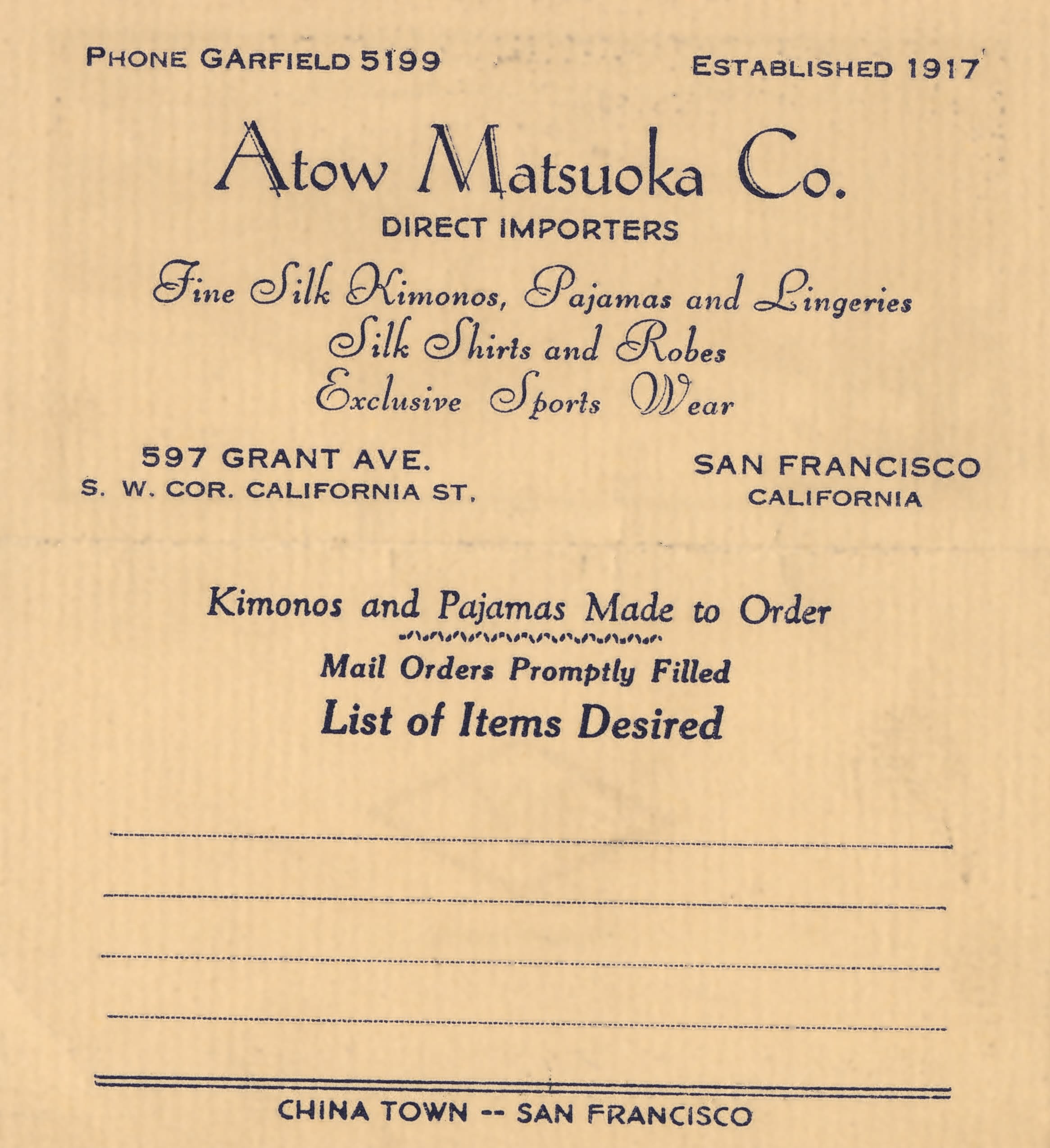 Ko Matsuoka 松岡 興, born in 1881, embarked on his journey to America in 1908. He established Atow Matsuoka Co., an "Oriental" curio store located on Grant Avenue, catering primarily to tourists. Over the years, Matsuoka made several trips from the United States to Japan, likely in pursuit of his business interests. His success was evident as he traveled first-class on transpacific voyages.