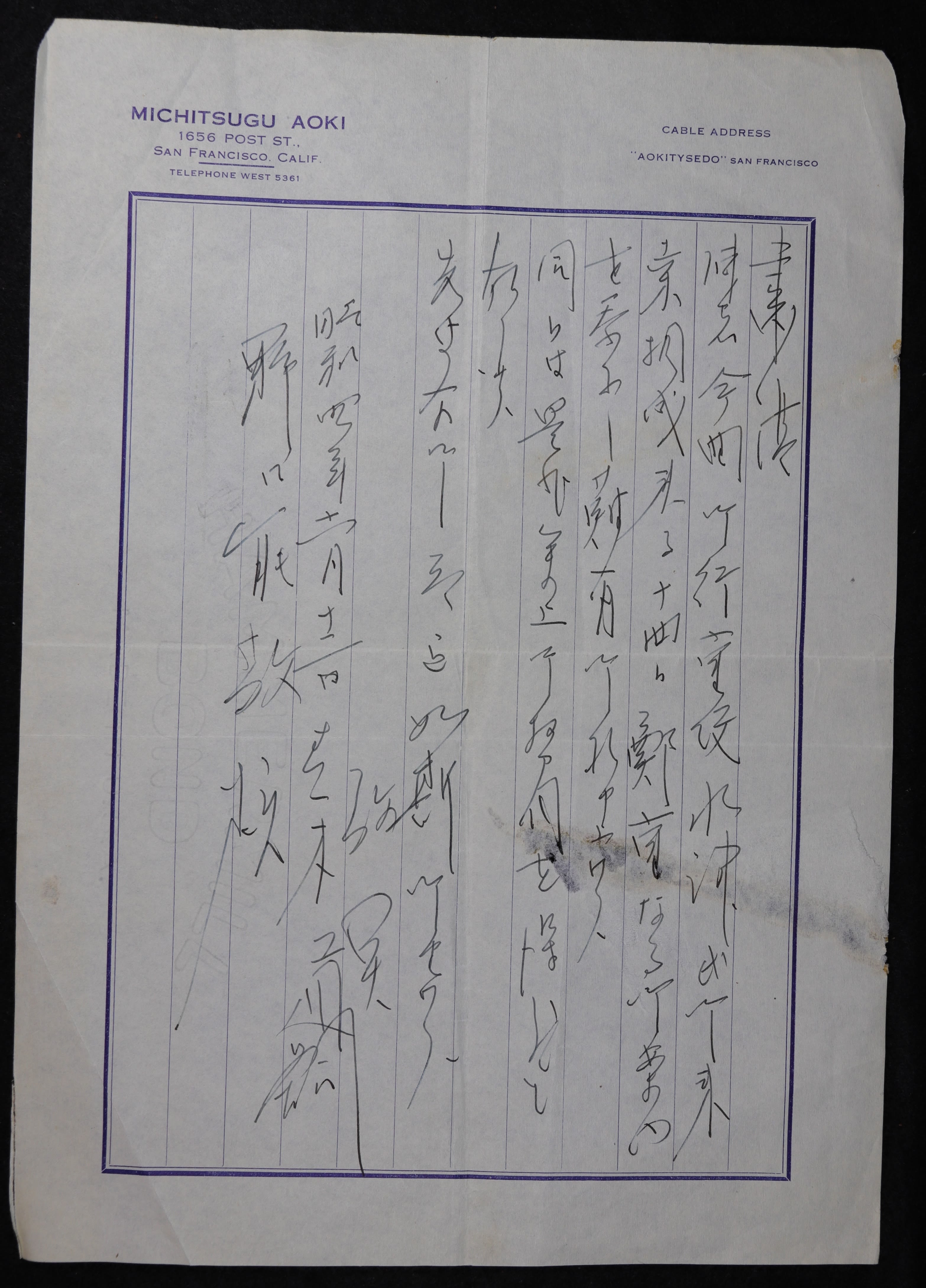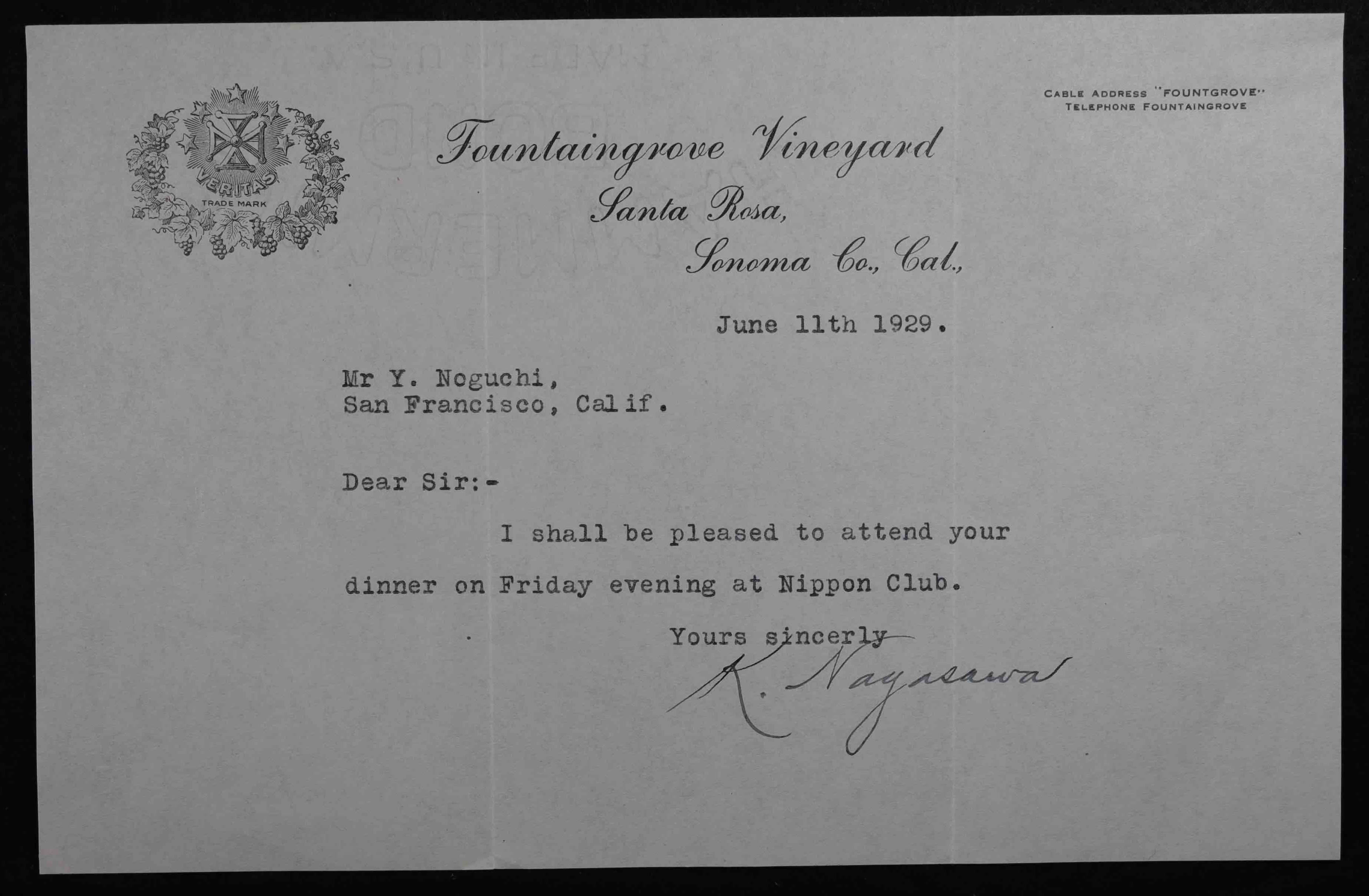 Dear Sir, I am very pleased to read your letter and thank you for your kind invitation to a dinner party for Mr. Yakichi Mizutsu, Director of your bank, on the occasion of his visit to San Francisco. I’m extremely honored to be notified of the invitation. I would like to reply in writing that I will humbly attend the dinner. Hiroshi Hatae, June 11, Showa 4 (1929)
