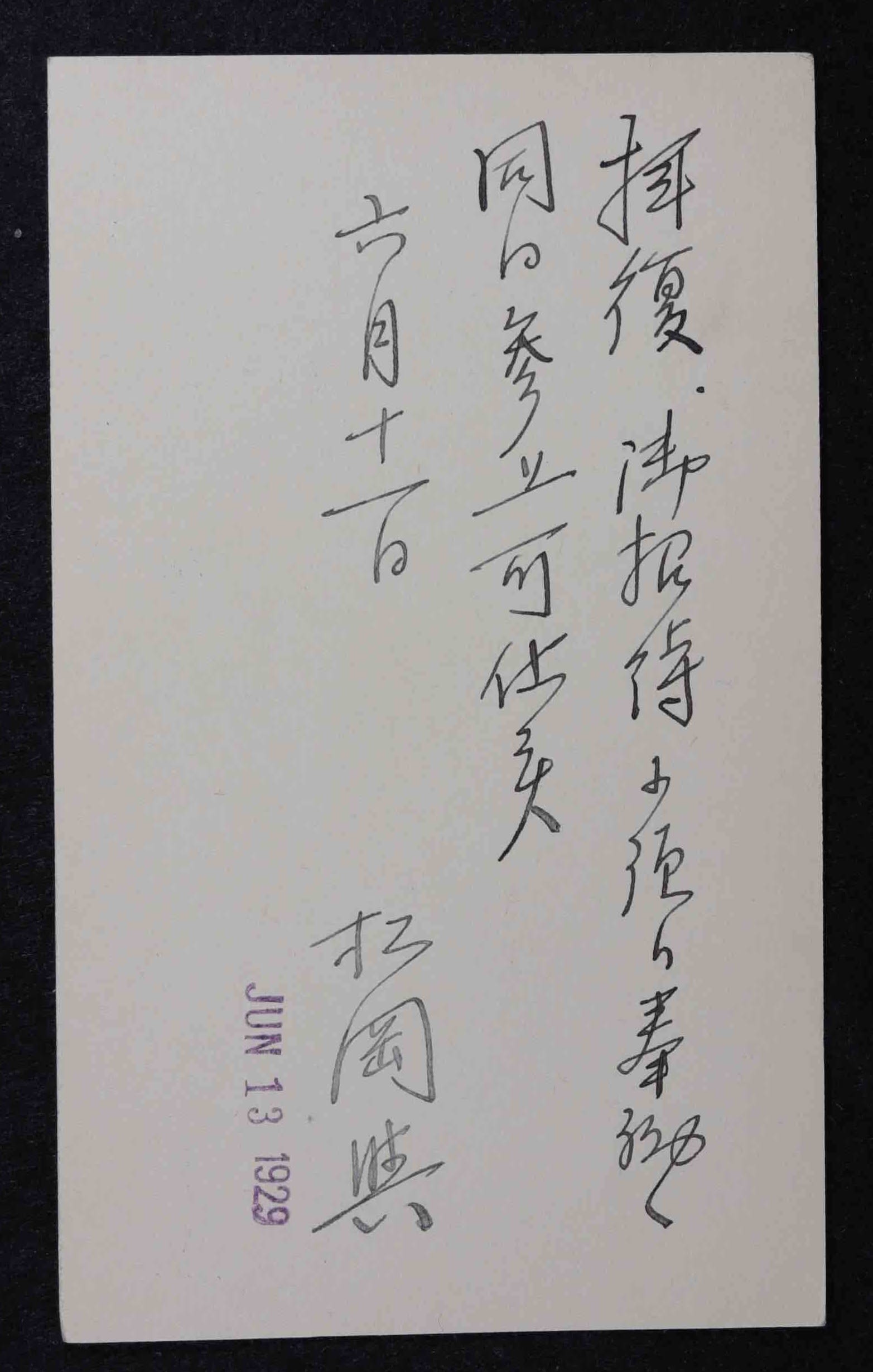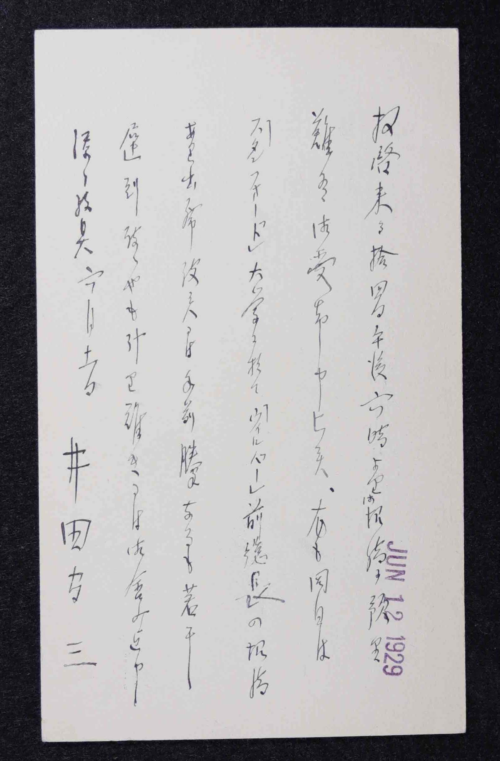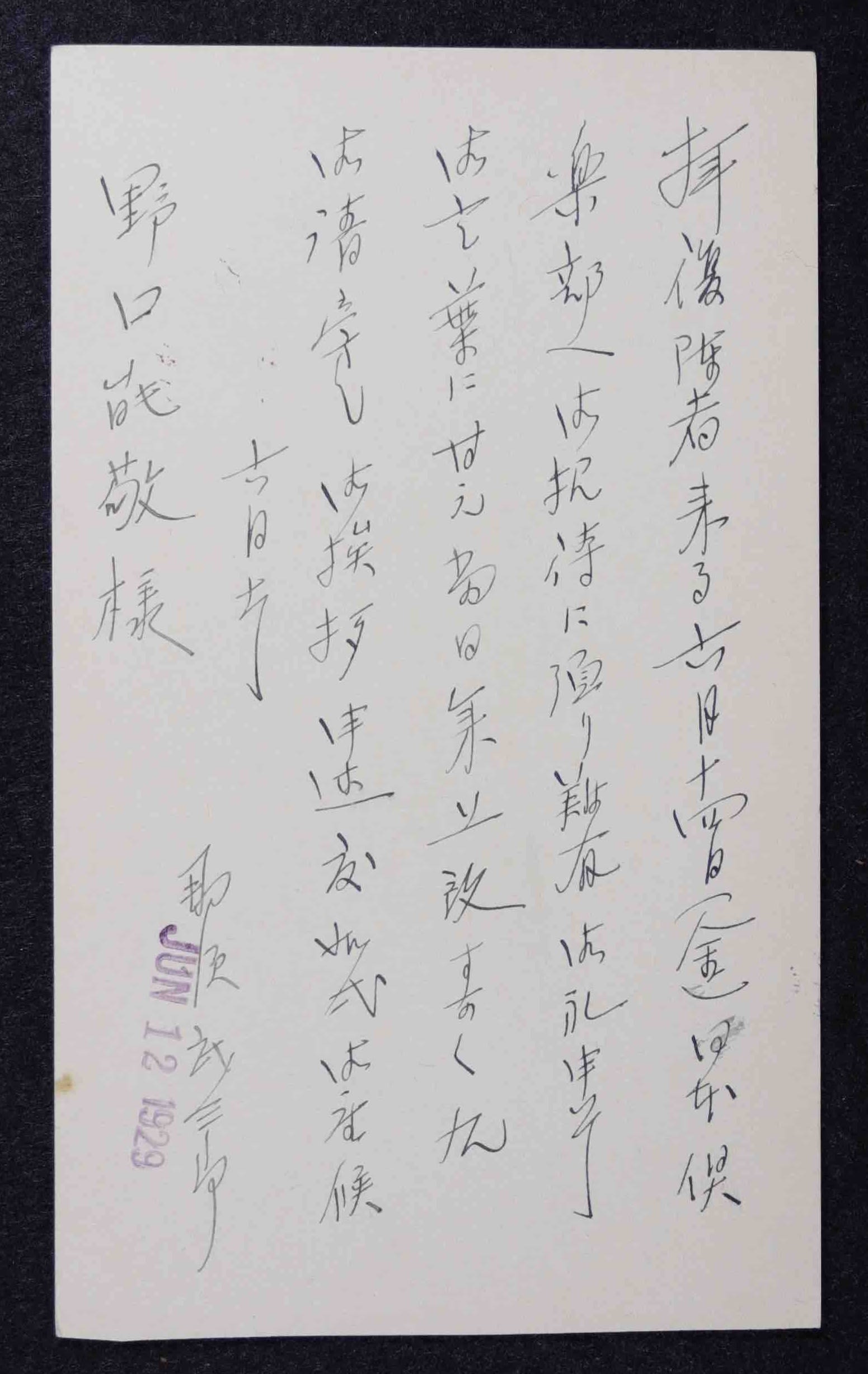 Takanoshin Domoto's reply card. YSB records, JAHA Archives, JCCCNC