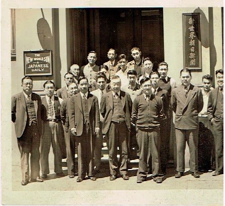 Shin Sekai Asahi Shinbun Staff. Toyoji Abe in the middle, Iwao Kawakami to his left, and Iwao Shimizu in the far left of the second row. Iwao Shimizu Papers, Hoover Institution Library & Archives