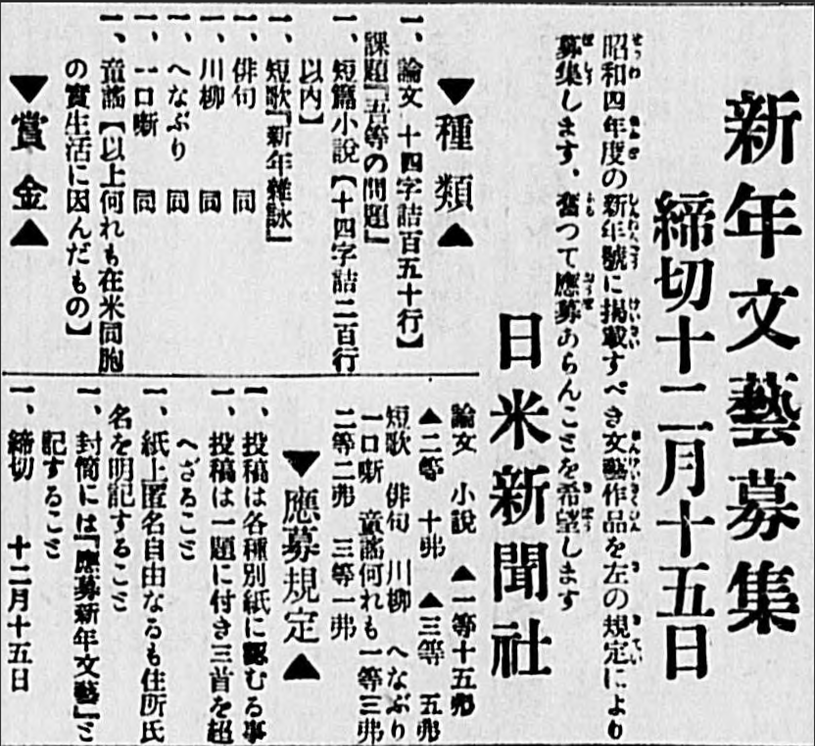 New Year Call for Literature and Arts to be featured in the 1929 New Year edition of The Nichi Bei. Hojishinbun Digital Collection, Hoover Institution Library & Archives