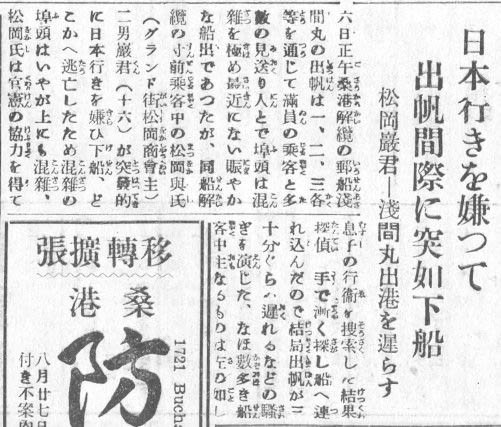 日本行きを嫌って突如出帆間際に下船。松岡巌君浅間丸出稿を遅らす. Iwao Matsuoka [Ko Matsuoka's second son age 16] suddenly disembarked just before setting sail, because he did not want to go to Japan. He delays the departure of the Asama Maru.